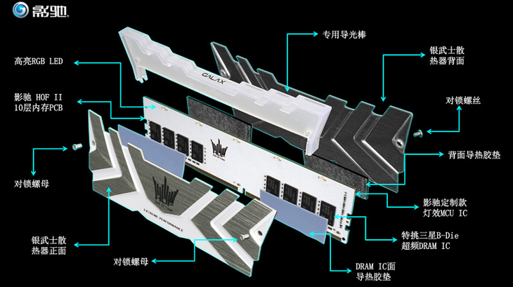 從外觀上來看,影馳名人堂HOF II系列的內存條採用白色搭配鋁合金拉絲外殼。在皇冠式散熱外殼的正面印有名人堂的logo,外殼設計靈感源自電影《金剛狼2》中「銀武士」的造型,內存條的上部是印有影馳「GALAX」字樣的專用導光體,可以釋放7色不同的燈光效果。