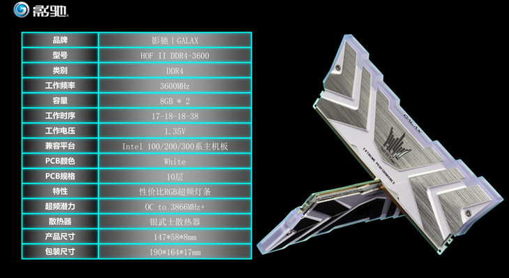 參數方面,影馳 名人堂HOF II也沒有讓一眾DIY粉絲失望,工作電壓為1.35V,使用了10層PCB板作為基礎,其上放置的是8顆三星的b-die DRAM顆粒,具備良好的超頻性能,官方稱超頻潛力可以達到4000MHz且支持XMP一鍵超頻(如果主板支持的話)。3600MHz的默頻下擁有著C17的時序,這在同頻率的內存條中可以說是相當不錯的水平了,在內存條的正反面都有用於導出熱量的膠墊,保證了內存條能夠穩定的運行在高負荷場景之中。內存金手指部分達到了10微米的厚度,能夠減輕多次拔插對於內存的磨損。