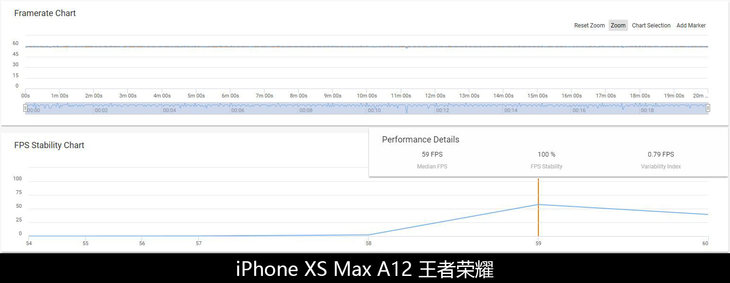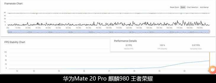 通過三款搭載最高端晶片旗艦機的幀率表現,我們可以看到完整的幀率波動情況。搭載麒麟980處理器的華為Mate 20 Pro在完整跑完遊戲後的【中值幀率 Median FPS】最高,達到了61FPS(遊戲默認幀率上限為60FPS)。其次分別是三星S10的60FPS與iPhone XS Max的59FPS。這裡已經能明顯看出來是「神仙打架」了。
