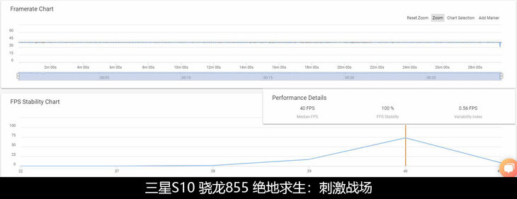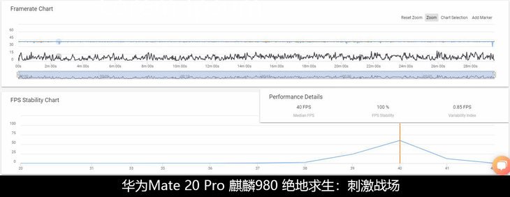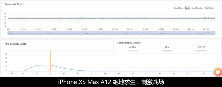 我們來直接看結果。三款中值幀率都能跑滿40FPS。其中iPhone XS Max幀率波動最為明顯,數據顯示幀率穩定性掉到了99%,另外兩款穩定性均在100%。幀率可變性指數 iPhone XS Max為1.16FPS、華為Mate 20 Pro為0.85FPS、三星S10為0.56FPS。根據測試結果顯示,恢復最快的是搭載驍龍855處理器的三星S10。