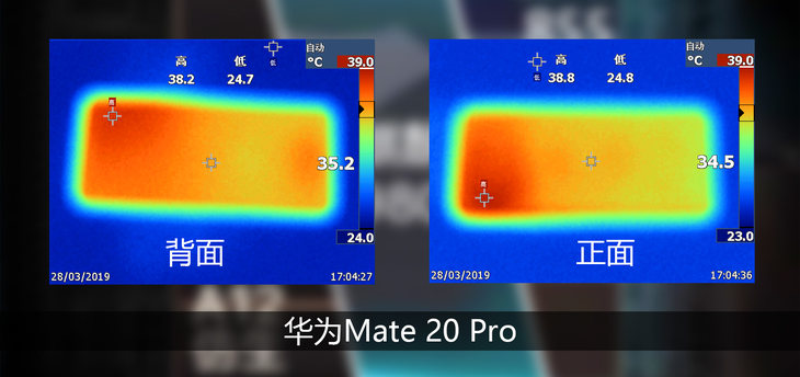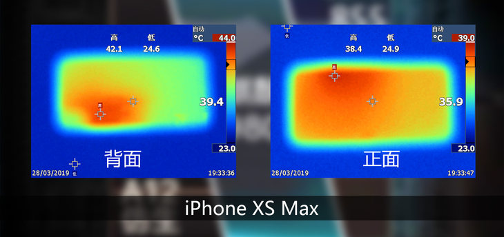 三款旗艦iPhone XS Max背部溫度最高,達到了42.1°,發熱點非常集中,主要在背部攝像頭下方位置。背部華為Mate 20 Pro的溫度最低,為38.2°。三星S10(採用銅管散熱,S10+擁有碳纖維散熱,理論上效果會更好)的發熱量位於兩款之間。機身正面華為Mate 20 Pro溫度最高,38.8°,另外兩款相差也不大,可以發現三星S10整體熱量傳到比較平均,而另外兩款熱量更為集中。