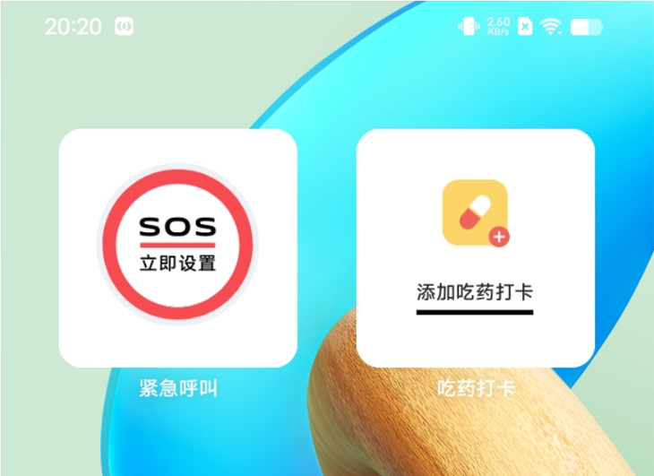 手機還提供了緊急呼叫組件,可以在主屏上添加,以便更快捷的操作。同時也支持吃藥打卡組件,可以提前設置好吃藥的信息,手機會定時提醒用戶吃藥。