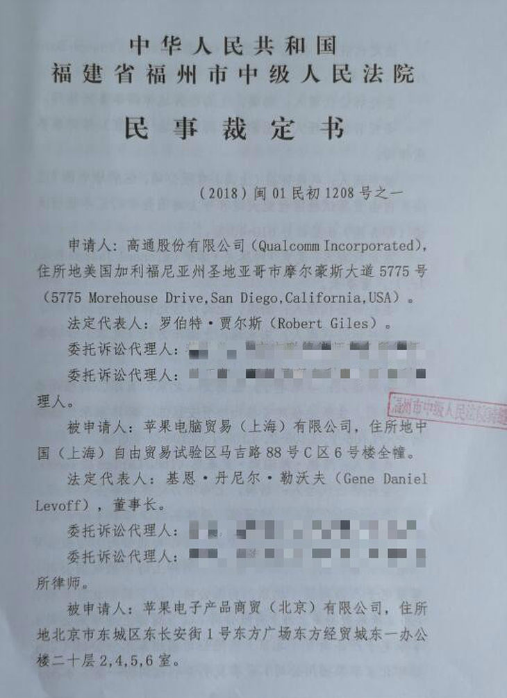 民事裁定書顯示,該案件於2017年11月15日立案,截至目前已經超過了1年時間。美國高通公司為原告,被告則為蘋果在中國的四家子公司,分別是蘋果電腦貿易(上海)有限公司,蘋果電子產品商貿(北京)有限公司,蘋果貿易(上海)有限公司以及蘋果電子產品商貿(北京)有限公司福州泰禾分公司。