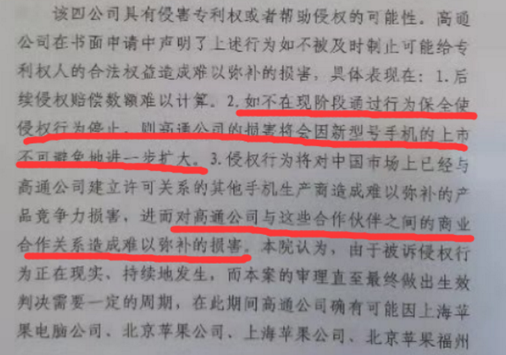 高通表示如果蘋果的侵權行為不及時制止,將會造成後續侵權賠償數額難以計算等問題,此外,蘋果新型號的手機上市也會進一步擴大高通公司的損害。高通還認為蘋果的侵權行為將對中國市場上已經與高通公司建立許可關係的其它手機廠商造成產品競爭力損害。