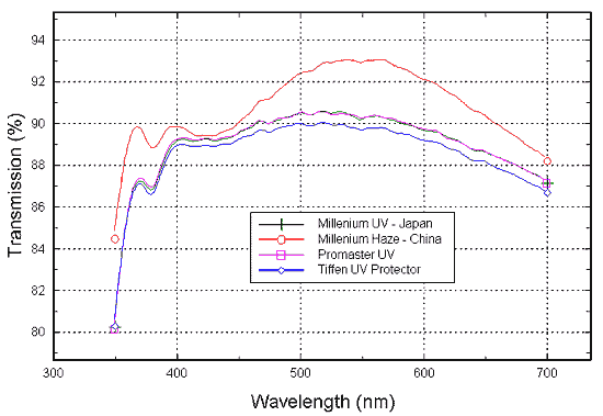 順便說一句,仔細觀察,我們發現四種吸收較差的濾鏡的吸收曲線十分相似,日本產Millennium UV和Promaster UV濾鏡的曲線更是幾乎相同。強烈懷疑它們是由同一家代工廠生產的貼牌產品。Tiffen UV保護鏡的曲線與它們也極為相近,如果不是同一家工廠的貼牌產品,至少也使用了同一種玻璃材料。